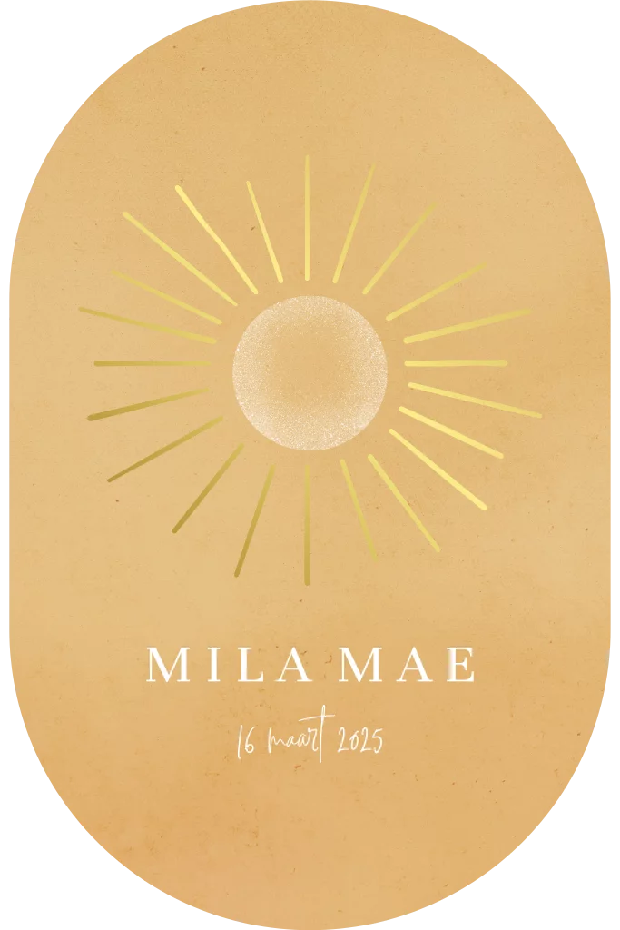 Uniek ovaal geboortekaartje met goudfolie zon voor een meisje