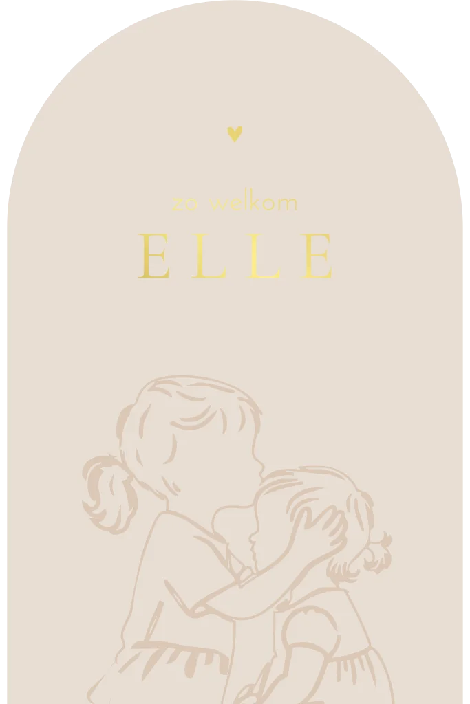 Lief geboortekaartje voor een tweede kindje. Het kaartje heeft een originele arch vorm met beige achtergrond. Op het kaartje zie je een lijntekening van een grotere zus die haar zusje een kusje geeft. De naam en tekst wordt gedrukt in goudfolie.