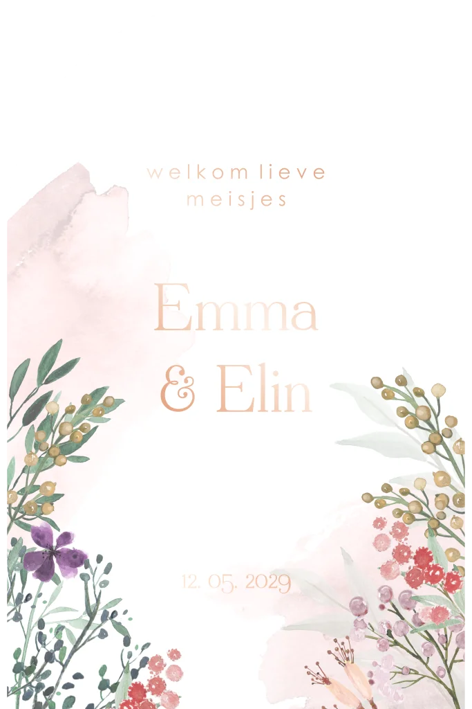 Een origineel geboortekaartje in de vorm van een arch. Op het kaartje zie je mooie roze watercolour. Daarop zie je verschillende watercolour bloemen. De namen worden gedrukt in roségoudfolie. Dit geboortekaartje voor jou zoon is volledig naar wens aan te passen in onze online editor.