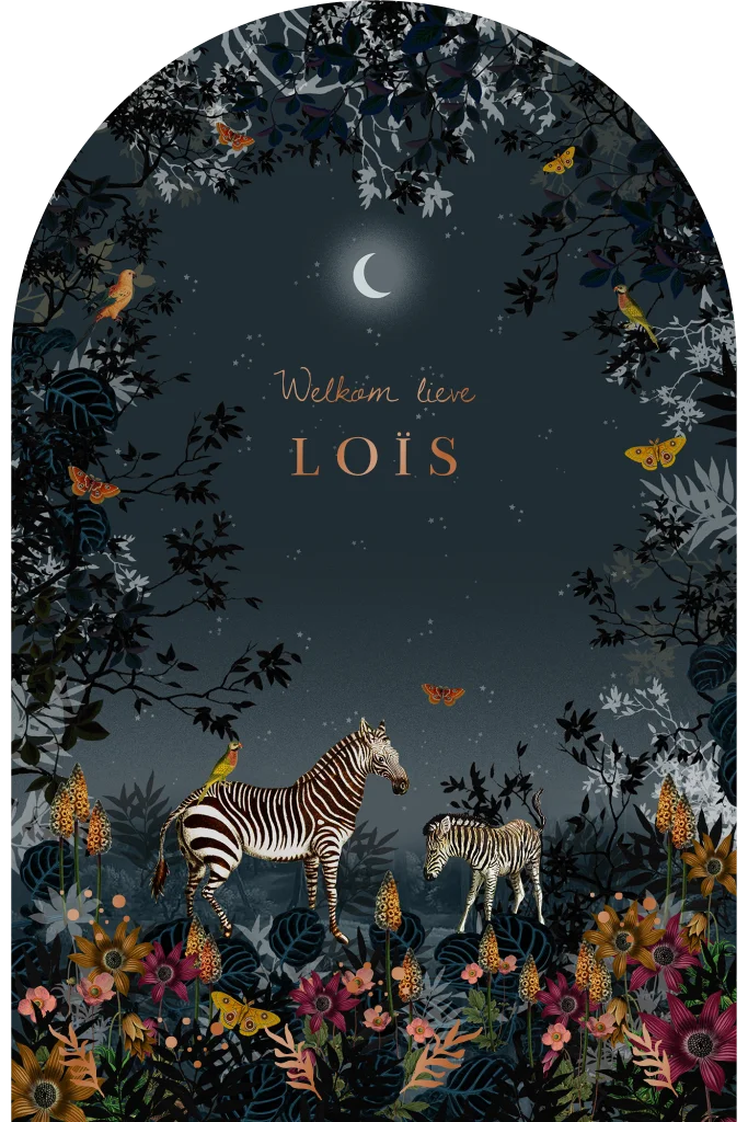 Wat een mooi geboortekaartje voor jouw dochter. Dit kaartje heeft een arch vorm en prachtige illustraties van zebra's. Het kaartje heeft een warme dromerige uitstraling en prachtige illustraties van bloemen en takken.
