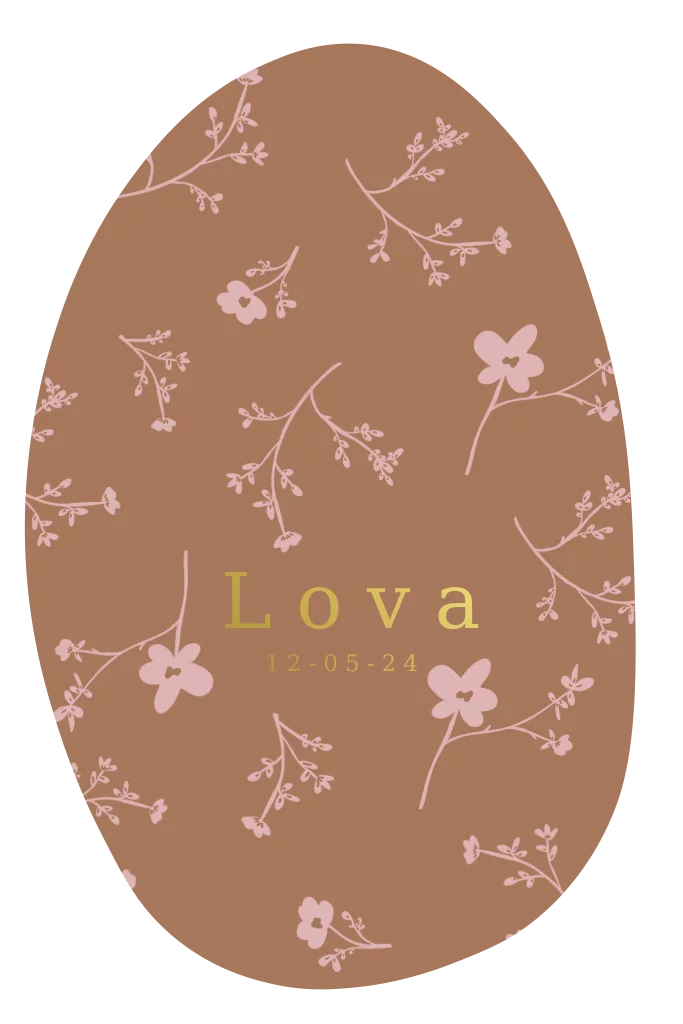 Een prachtig origineel geboortekaartje met een lief bloemenpatroon. Het kaartje heeft een roestkleur als achtergrond en de bloementjes daarop zijn lichtroze. De naam en geboortedatum is gedrukt in goudfolie.