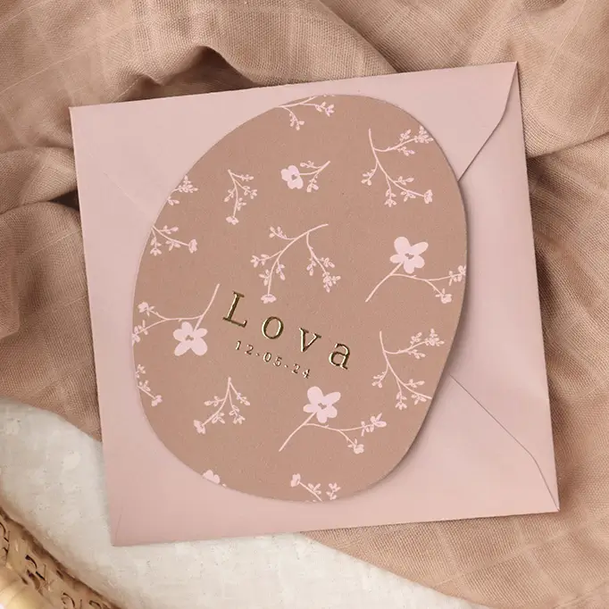 Een prachtig origineel geboortekaartje met een lief bloemenpatroon. Het kaartje heeft een roestkleur als achtergrond en de bloemetjes daarop zijn lichtroze. De naam en geboortedatum is gedrukt in goudfolie.