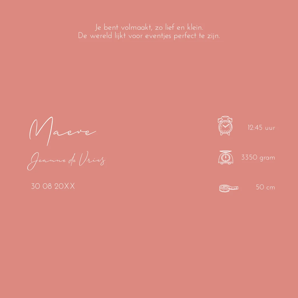 Wat een tof geboortekaartje. Dit kaartje heeft een schattig doorkijkje in de vorm van een meisjes silhouetje. De binnenkant heeft een roze koraal kleur en is volledig naar wens te bewerken in onze online editor. Bestel een proefdruk om het kaartje in het echt te bewonderen.