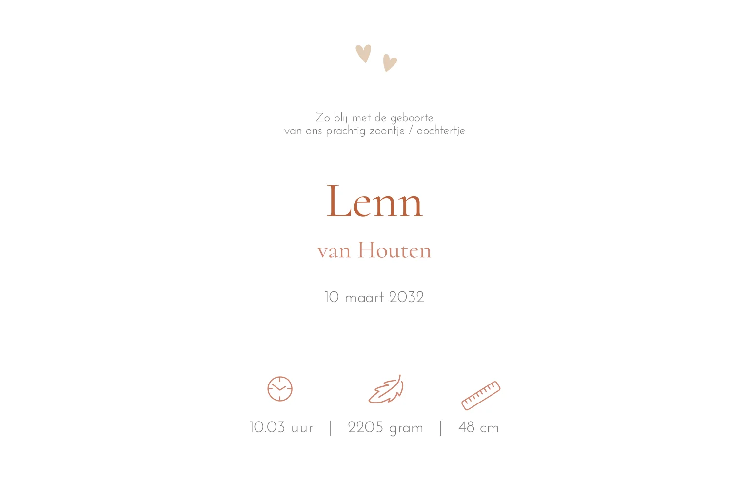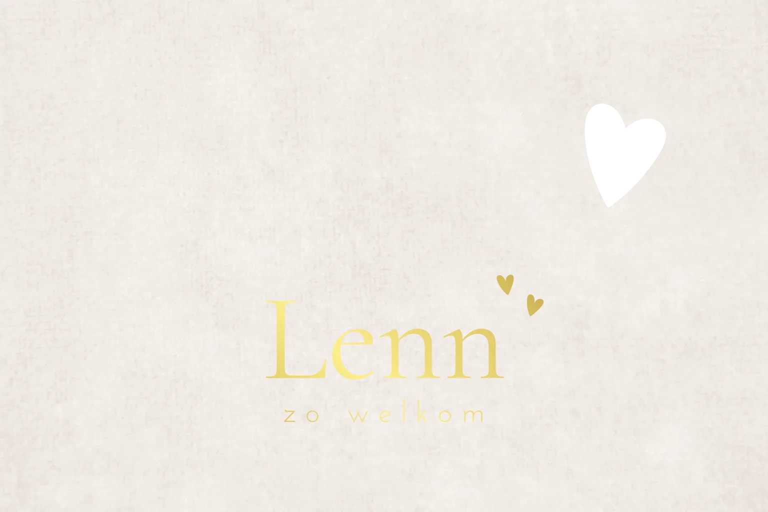 Dit is een mooi kaartje voor je pasgeboren zoon of dochter. Het kaartje heeft een beige achtergrond met hartvormig doorkijkje. De goudfolie naam en hartjes geven dit kaartje een luxe uitstraling. Het kaartje kan helemaal naar wens aangepast worden in onze online editor.