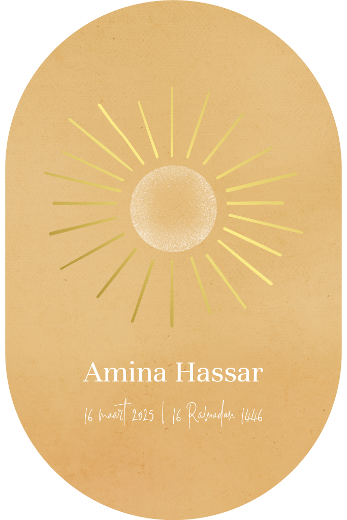 Kondig de geboorte van jullie kindje aan met dit unieke Islamitische kaartje. Het kaartje heeft de vorm van een ovaal. De gele achtergrond in combinatie met de goudfolie zon geeft een prachtig effect. Pas het kaartje naar wens aan in onze online editor en bestel snel een proefdruk om dit kaartje in het echt te zien!