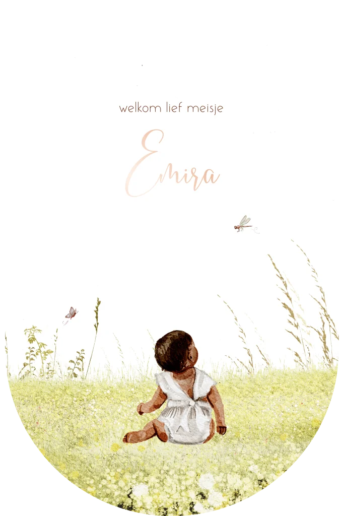 Een uniek geboortekaartje met een schattige illustratie van een kindje in het gras. Het kindje geniet van alles om haar heen in het gras dit voorjaar. Verwacht je een kindje deze lente of zomer? Dan is dit kaartje helemaal toepasselijk. Pas naar wens het kaartje aan en bestel een proefdruk om het kaartje in het echt te bekijken.
