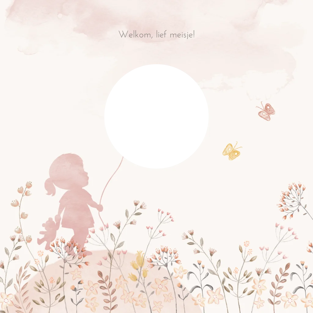 Een lief watercolour geboortekaartje met een silhouet van een meisje. Het silhouetje staat tussen een veld vol bloemen. Het kaartje heeft een uitgesneden rondje met daarin een doorkijkje naar de naam van jullie dochter. Pas dit kaartje naar wens aan in onze online editor.