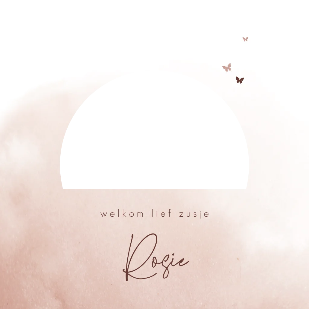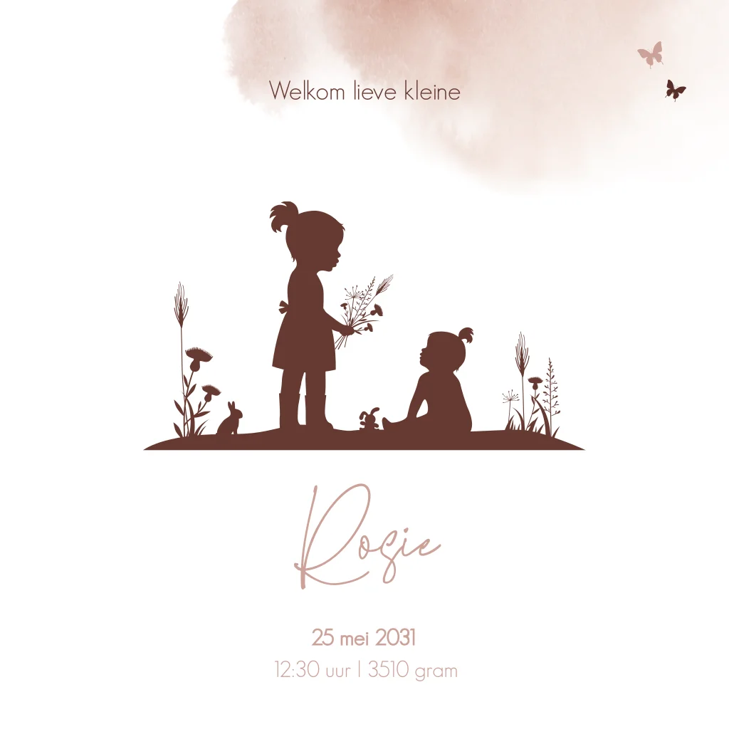 Kondig de geboorte van je dochter aan met dit lieve kaartje! Het kaartje heeft een watercolour achtergrond met een doorkijkje. Op de binnenkant van de kaart zie je de silhouetjes van twee zussen in een bloemenveld. Het kaartje kan helemaal naar wens aangepast worden in onze online editor.