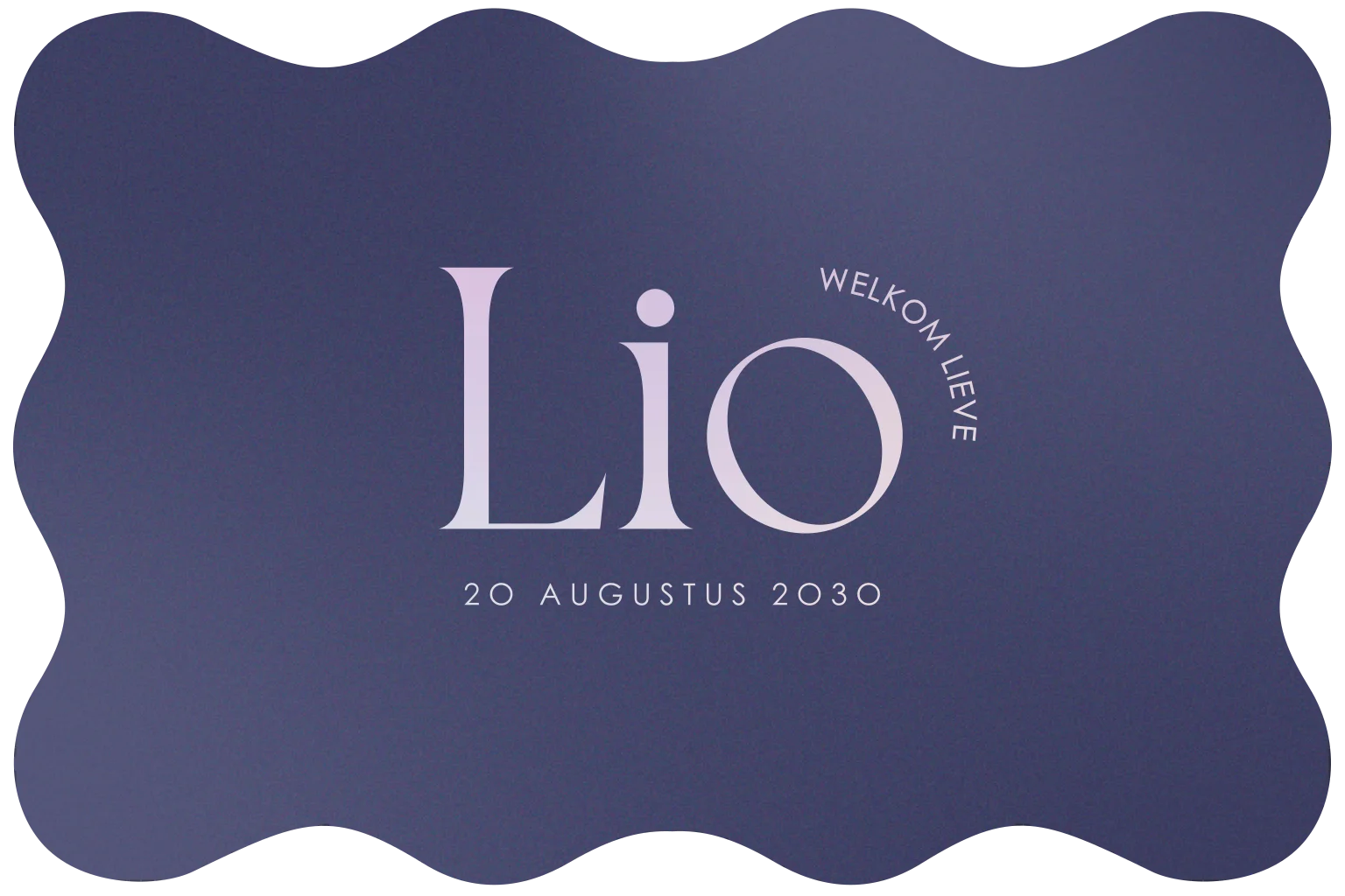Dit unieke geboortekaartje is gebaseerd op de Extra Celestial-trend. De kleur is Future Dusk, een unisex kleur dat tussen paars en blauw hangt. Deze kleur is uitgekozen als kleur van het jaar door Pantone. Met de holografische folie krijgt het kaartje een bijzonder effect. Bewerk zelf in onze editor.