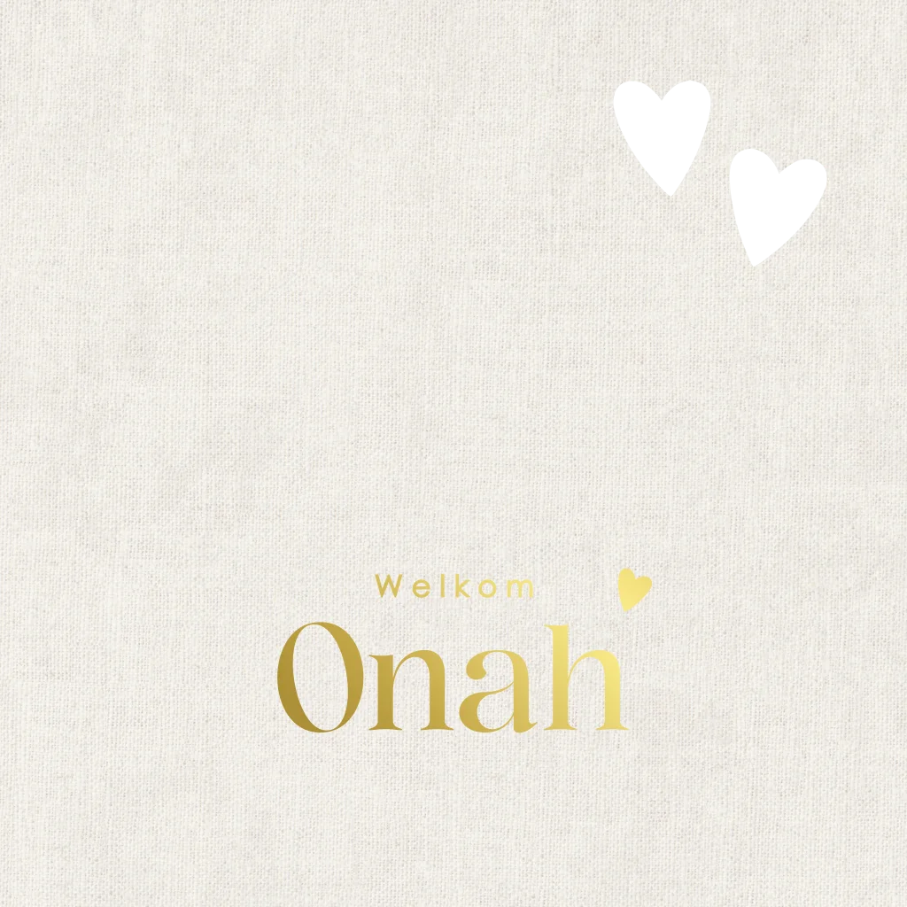Een prachtig geboortekaartje met 2 doorkijkjes in een vorm van hartjes aan de voorzijde van de kaart. De naam is hier gedrukt met goudfolie op een linnen-look achtergrond. Pas deze kaart makkelijk aan in de editor.
