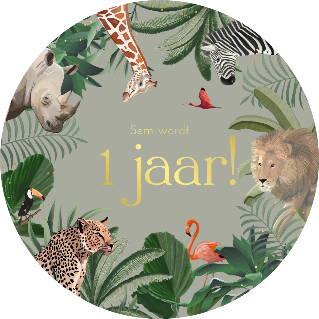 Een hippe jungle verjaardagsuitnodiging in een unieke ronde vorm. Het kaartje heeft prachtige illustraties van verschillende jungledieren. De letters zijn gedrukt in goudfolie en maken de uitnodiging echt feestelijk! Pas deze uitnodiging, voor de 1e verjaardag van jullie kindje, gemakkelijk aan in onze online editor.