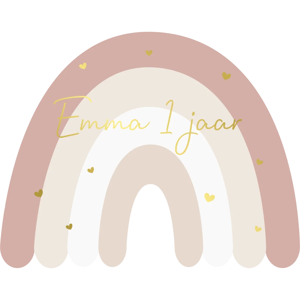 Een originele uitnodiging voor de verjaardag van jullie dochter. De verjaardagsuitnodiging heeft de vorm van een regenboog. De naam en de hartjes zijn gedrukt in goudfolie. De uitnodiging voor de eerste verjaardag kan je gemakkelijk bewerken in onze online editor.