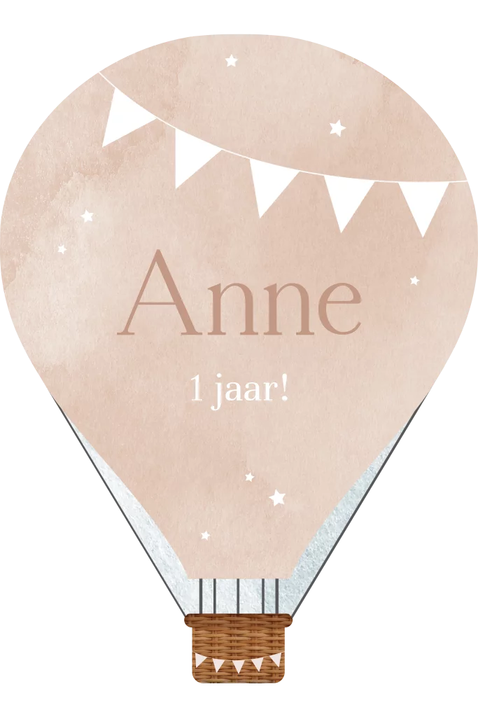 Het kaartje heeft een vorm van een luchtballon en is daardoor echt uniek! Het feestje begint al bij het krijgen van deze uitnodiging. Pas het kaartje naar wens aan in onze online editor.