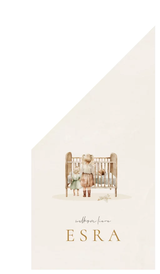 Hoera, de vlag kan uit, jullie kleintje is geboren! De vlag heeft zachte kleuren en prachtige illustraties van grote zussen bij het ledikantje van hun nieuwe broertje of zusje. De vlag is naar wens op te maken in de online editor.