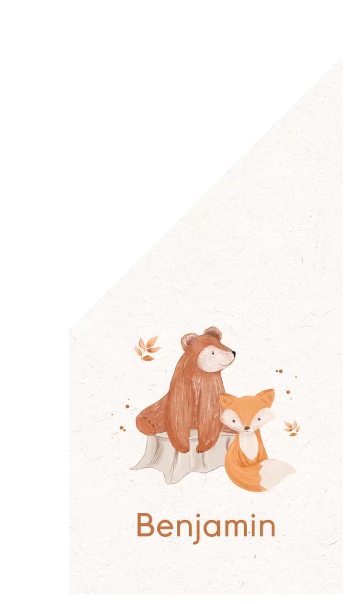 Een lieve geboortevlag passend bij het geboortekaartje van jouw kindje. De vlag heeft een illustratie van een lieve beer en vos. Pas het ontwerp naar wens aan in onze online editor.