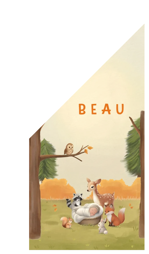 Een lieve geboortevlag om de geboorte van jullie kindje aan te kondigen. De vlag heeft een schattige illustratie van een baby in een mandje omringd door bosdieren in het bos. Pas het ontwerp naar wens aan in onze online editor.