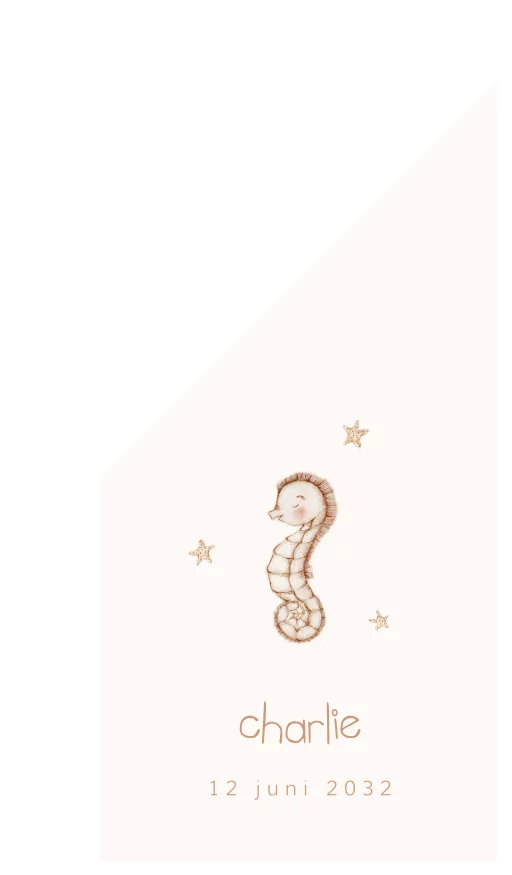 Een stijlvolle geboortevlag voor jouw kindje. De sticker heeft een prachtige beige illustratie van een zeepaardje omringd door zeesterren. Daaronder is ruimte voor tekst. Pas het ontwerp naar wens aan in onze online editor.