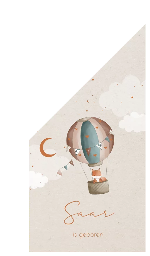 Een vrolijke en dromerige geboortevlag voor jouw kindje. De vlag heeft een beige achtergrond met daarop een luchtballon en vosje. Ook zie je wolkjes en een maantje. Pas het ontwerp naar wens zelf aan.