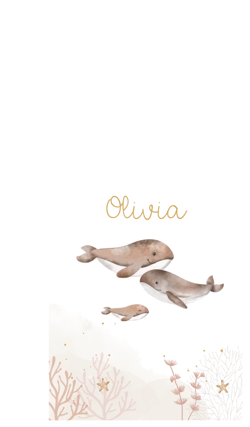 Een lieve geboortevlag passend bij het geboortekaartje. De vlag heeft beige tinten en prachige illustraties van walvissen in de zee. Pas het ontwerp naar wens aan in onze online editor.
