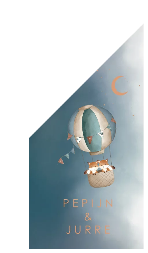 Hoera, de vlag kan uit, jullie tweeling is geboren! De vlag heeft een blauwe achtergrond met een mooie sterrenhemel. Op de voorgrond staat een luchtballon met twee vosjes afgebeeld. De vlag is eenvoudig aan te passen in de online editor.