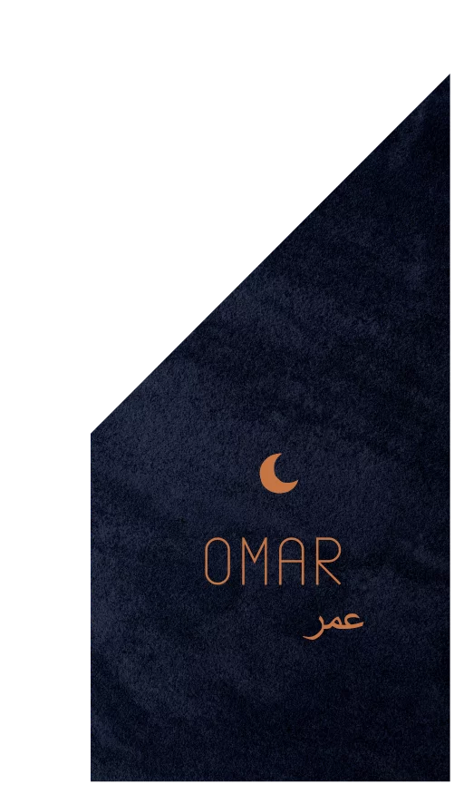 Islamitische geboortevlag met maantje voor een jongen. De naam van je zoontje en het maantje zijn in koperkleur geschreven en dat past leuk bij de blauwe velvet-look achtergrond. De arabische tekens en details in koperfolie geven een luxe uitstraling aan de vlag. Je kunt de vlag alvast bestellen voor de geboorte van je kindje. Pas de vlag naar wens aan in onze online opmaaktool!