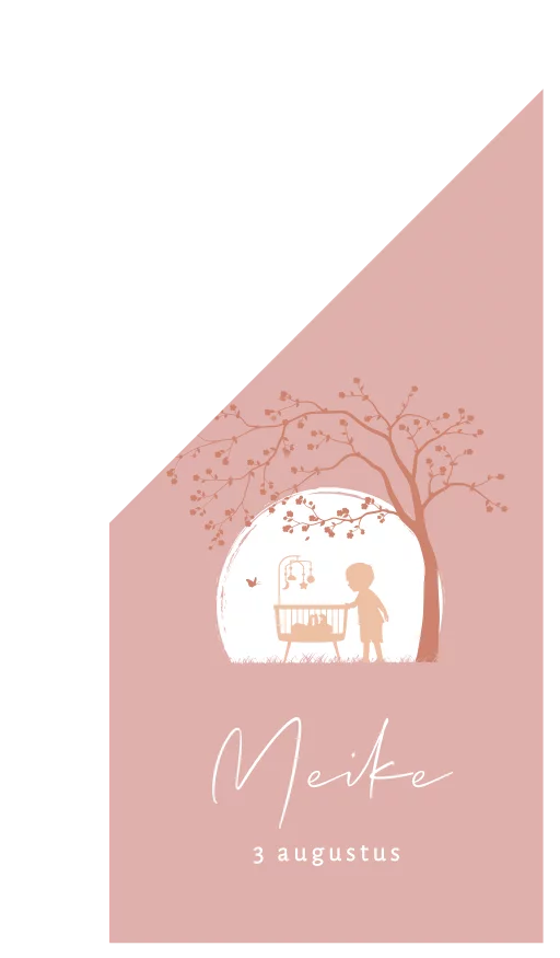 Romantisch, dit tafereeltje op deze geboortevlag voor een zusje! Onder de boom kijkt een kindje in de wieg naar het zusje, terwijl er een vrolijk vlindertje voorbij fladdert.