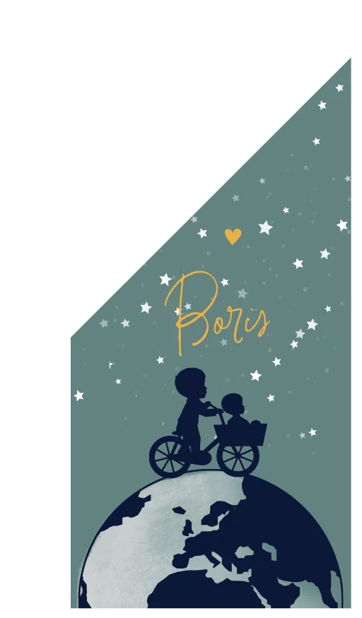 Een lieve geboortevlag met de silhouetjes van jullie twee kindjes. Op de vlag zie een klein broertje met zijn grote broer op de fiets over de wereld onder de sterrenhemel. Deze vlag kun je personaliseren naar jouw eigen gezinssituatie in onze online editor.