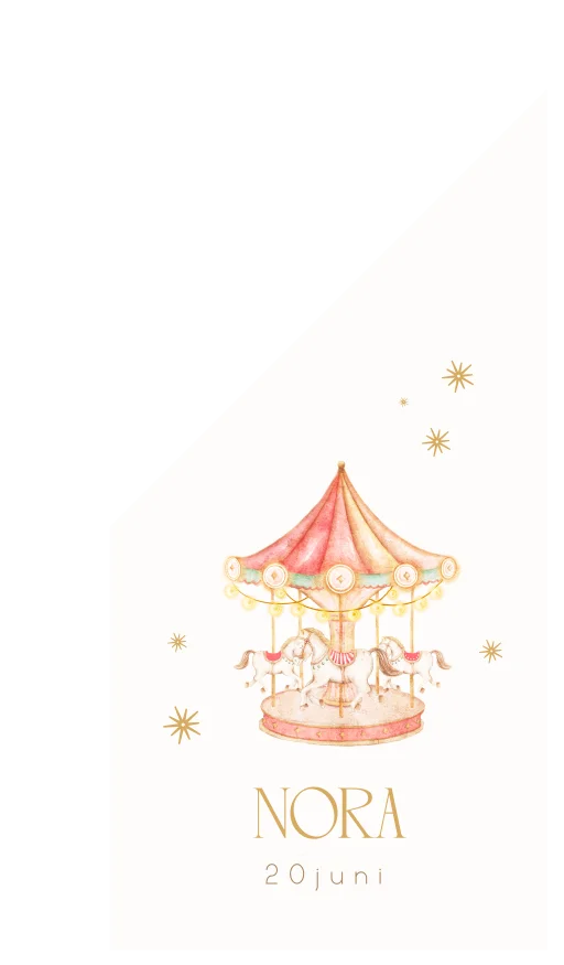 Een geboortevlag bijpassend bij het geboortekaartje. De vlag heeft een illustratie van een carrousel met paardjes. De vlag heeft zachte roze en rode tinten. Pas het ontwerp naar wens aan in onze online editor.