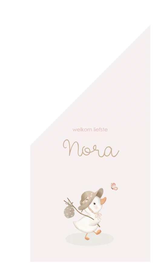 Een schattige geboortevlag passend bij het geboortekaartje. De vlag heeft een lichte achtergrond met daarop een lieve illustratie van een eendje en vlinder. Pas het ontwerp naar wens aan in onze online editor.
