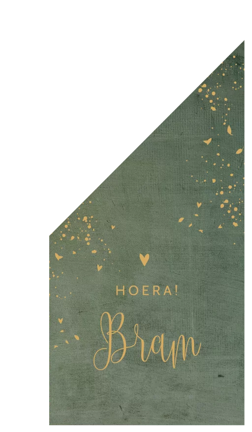 Hoera, de vlag kan uit, jullie zoontje is geboren! De vlag heeft een groene velvet-look achtergrond met vrolijke spetters. De naam wordt gedrukt in een sierlijk lettertype. De vlag is eenvoudig aan te passen in de online editor.
