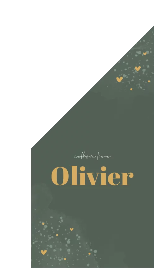 Leuke geboortevlag om de geboorte van je kindje aan te kondigen! De vlag is in het groen met de naam in goudkleur in het midden. In de hoeken een wolk van spetters en hartjes.