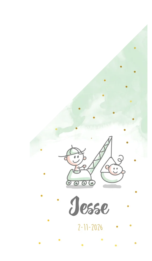 Laat iedereen weten dat jullie kindje geboren is met deze vrolijke geboortevlag. De vlag heeft een groene watercolour met daarop een illustratie van een grote broer met zijn jongste broer in een hijskraan. Pas de vlag naar wens aan in onze online opmaaktool.