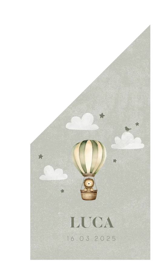 Hoera! Jullie kindje is geboren en iedereen mag het weten. Deze geboortevlag heeft een groene achtergrond met daarop een luchtballon met een schattig leeuwtje. Onder de afbeelding is er ruimte voor de naam van jouw kindje. Pas de vlag gemakkelijk zelf aan in onze online opmaaktool.