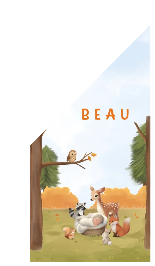 Een lieve geboortevlag om de geboorte van jullie kindje aan te kondigen. De vlag heeft een schattige illustratie van een baby in een mandje omringd door bosdieren in het bos. Pas het ontwerp naar wens aan in onze online editor.