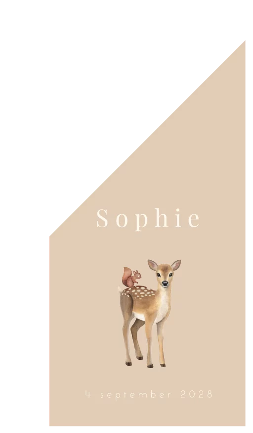 Je kleintje is geboren en dat mag de hele buurt weten! Deze vlag heeft een zandkleurige achtergrond met de illustraties van een hert en eekhoorn. Ook lees je de naam en geboortedatum van het kind op de vlag. Pas de vlag naar wens aan in onze online editor.