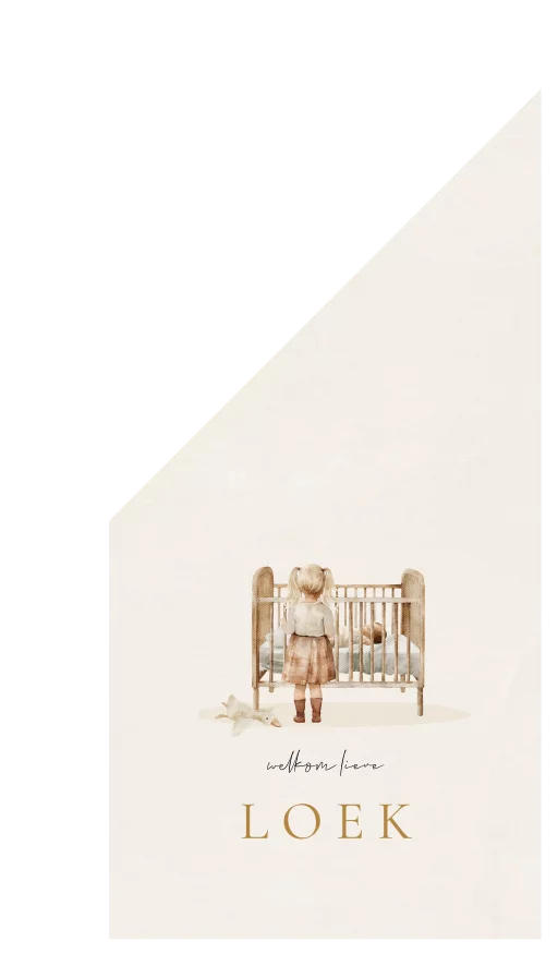 Hoera, de vlag kan uit, jullie kleintje is geboren! Op de vlag staat een illustratie van een grote zus bij het ledikantje van haar broertje of zusje. De kleuren zijn erg zacht. Pas het ontwerp naar wens aan in onze online editor.