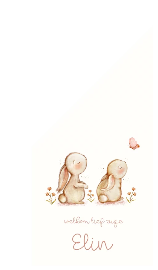Laat iedereen weten dat jullie kindje en zusje geboren is met deze hippe geboortevlag met lieve konijntjes en vlinder. De vlag heeft een creme kleurige ondergrond. Pas de vlag naar wens aan in onze online opmaaktool.