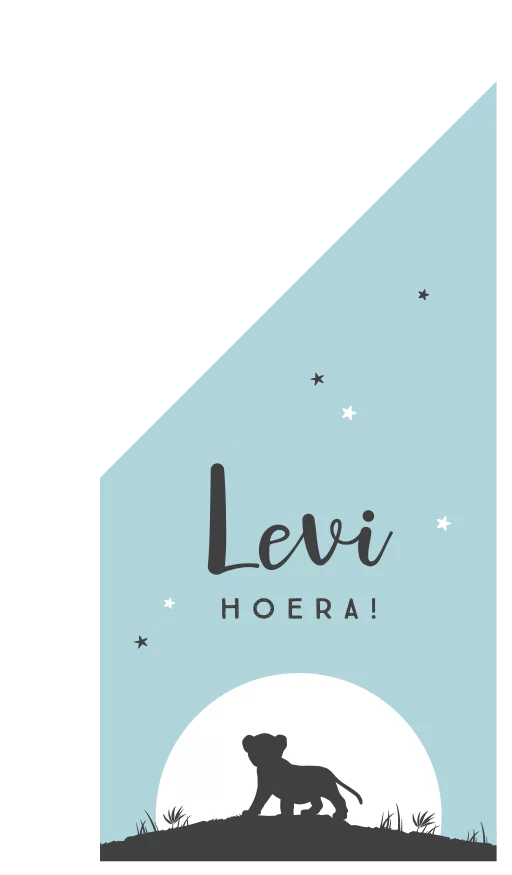 Hoera, een zoontje geboren, de vlag kan uit! Op dit stoere exemplaar zie je het silhouet van een leeuwenwelpje in een landschap. Op de blauwe achtergrond staat de naam tussen de zwarte en witte sterren, deze pas je gemakkelijk zelf aan in de online editor.