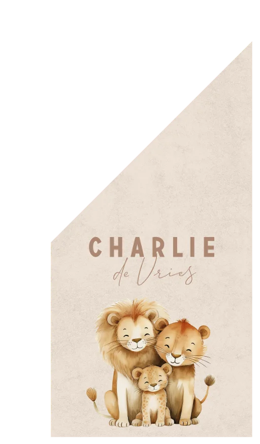 De vlag kan uit: jullie kindje is geboren! Op deze beige geboortevlag met de illustratie van een leeuwenfamilie staat de naam van jullie zoon/dochter, pas deze zelf eenvoudig aan in de online editor. Let op! Wil je deze vlag personaliseren? Vergeet dan niet om beide zijdes van de vlag aan te passen.