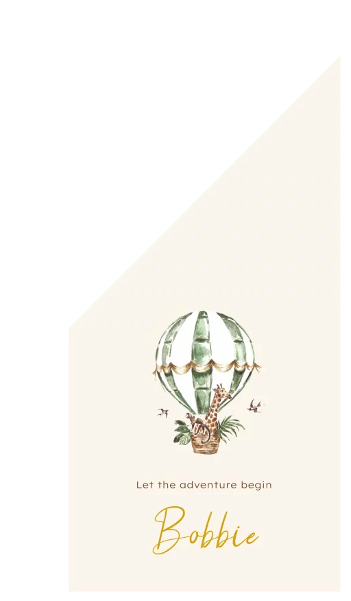 Een hippe geboortevlag met luchtballon en jungledieren. Pas het ontwerp naar wens aan in onze online editor.