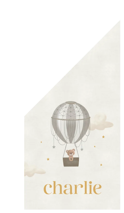 De vlag kan uit: jullie kindje is geboren! Op deze neutrale geboortevlag staat de illustratie van een beertje in een luchtballon. Onder de luchtballon staat de naam van jullie kleintje. Pas deze zelf eenvoudig aan in de online editor.