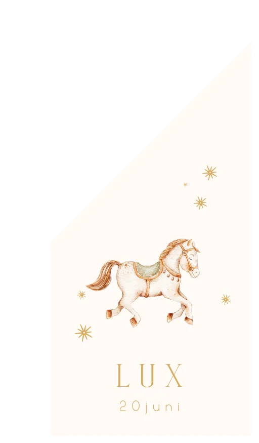 Een toffe geboortevlag om de geboorte van jullie kindje kenbaar te maken. De vlag heeft een lichte achtergrond met daarop een illustratie van een paard. Ook zie je verschillende sterretjes. Pas het ontwerp naar wens aan in onze online editor.