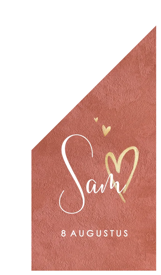 Yes, jullie dochter is geboren, de vlag kan uit voor deze stoere meid! De naam staat in een losjes geschreven lettertype centraal op een achtergrond van roodbruine velvet. Een open gouden hart en twee kleine hartjes erboven geven een lief accent.