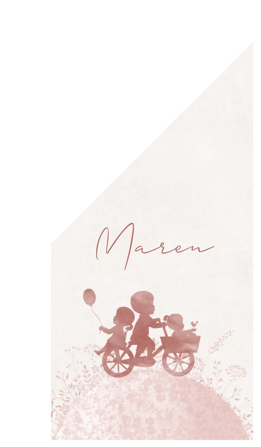 Wat een leuke geboortevlag. Deze vlag heeft een roze watercolour met lieve illustraties van drie silhouetjes op de fiets. Er is een zusje op komst! Pas de vlag naar wens aan in onze online editor.