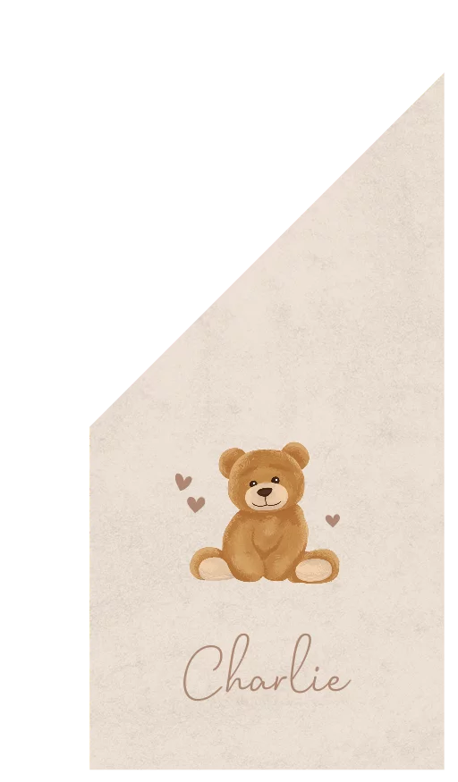 Hoera! Jullie kindje is geboren en iedereen mag het weten. Deze geboortevlag heeft een beige velvet-look achtergrond met daarop een schattige beertje met hartjes er om heen. Onder de teddybeer is er ruimte voor de naam van jouw kindje. Pas de vlag gemakkelijk zelf aan in onze online opmaaktool.