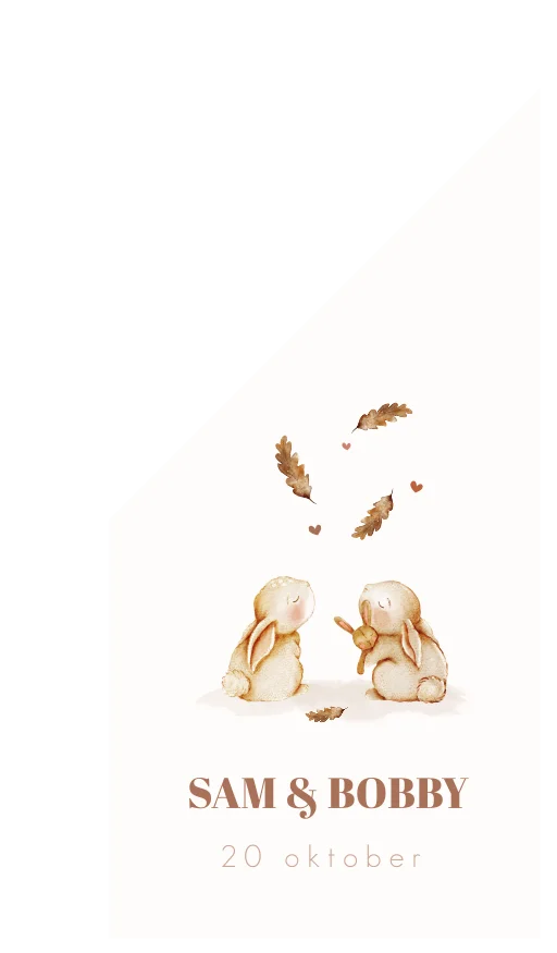 Een lieve geboortevlag voor jullie tweeling. De vlag heeft een schattige illustratie van twee konijntjes tussen de herfstbladeren. Pas het ontwerp naar wens aan in onze online editor. Ga je de vlag personaliseren? Vergeet dan niet beide zijdes op te maken.