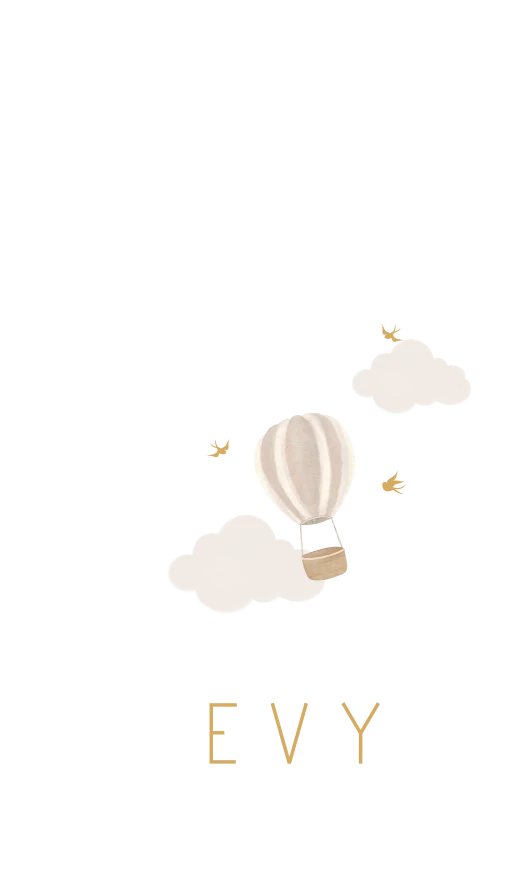 Een vrolijke en stijlvolle geboortevlag voor jouw kindje. De vlag heeft een witte achtergrond met daarop een lieve luchtballon en vogeltjes vliegend door de wolken. Pas het ontwerp naar wens aan in onze online editor.