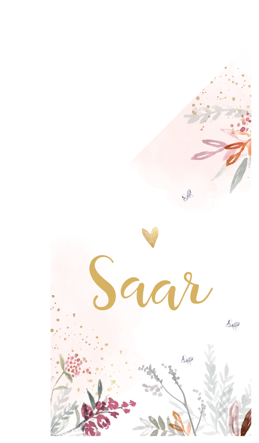 Maak de geboorteaankondiging van jullie meisje compleet met deze geboortevlag. De vlag heeft een ontwerp met prachtige watercolour bloemen. Boven de naam is staat een goudkleurig hartje. Pas de vlag naar wens aan in onze online editor.