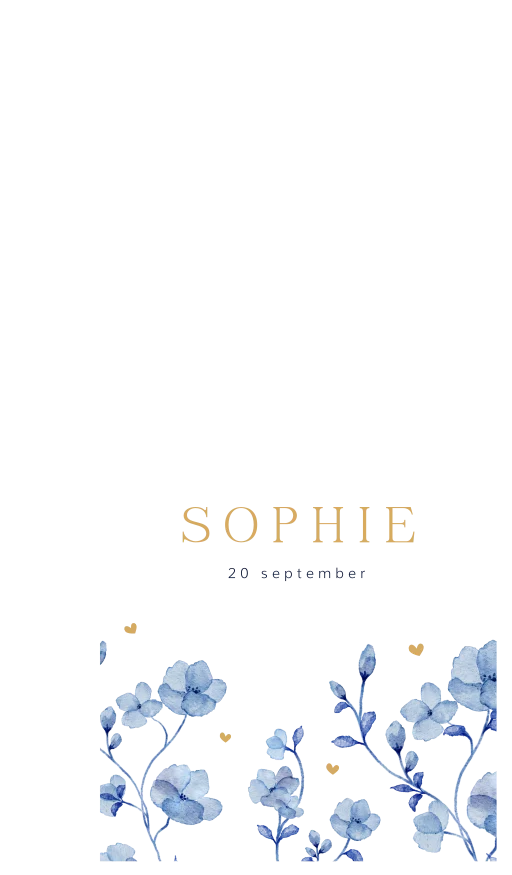 Je kleintje is geboren en dat mag de hele buurt weten! Op deze vlag staan watercolour delfts blauwe bloemen met kleine goudkleurige hartjes. De vlag is naar wens aan te passen in onze online editor.