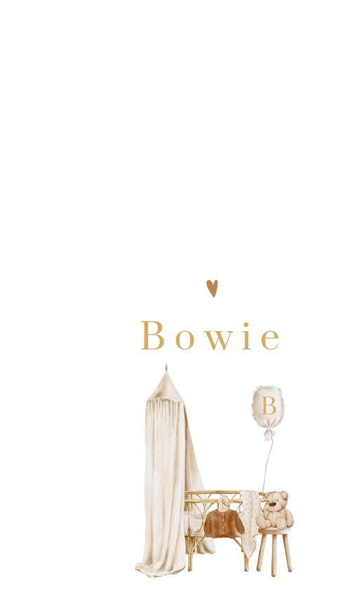 Witte geboortevlag om de geboorte van jouw kindje aan te kondigen. De vlag heeft prachtige illustraties van een rotan wiegje met een teddybeer. Pas het ontwerp aan beide kanten naar wens zelf aan in onze online editor.